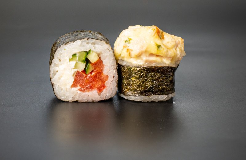 Рис, нори, копченая курица, огурец, помидор, сыр творожный, майонез, зеленый лук (8 шт.)