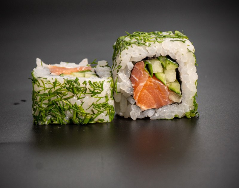 Рис, нори, копченый лосось, огурец, зеленый лук, укроп, сыр плавленый (8 шт.)