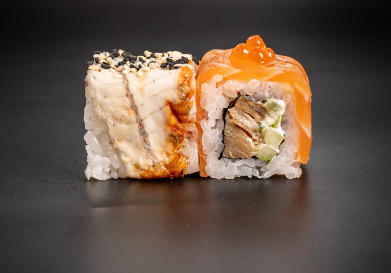 Рис, нори, лосось, угорь, огурец, японский омлет, сыр творожный, кунжут, зеленый лук, икра лососевая (6 шт.)